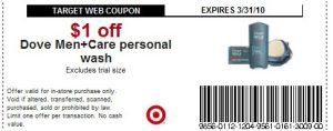 There is a $1/1 Dove Men+Care Wash coupon on the Target site that matches with the current ad: Dove Men + Care Bar Soap or Dove Beauty Bar, Assorted Varieties, 2 pk, 4.2 or 4.25 oz box, 2/$5**Kimberly Clark Rebate eligible HERE pair it with the $1/1 manufacturer coupon HERE and you score the body wash for .50¢ each!