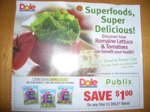 Dania emailed to let me know that she found a $1/1 Publix coupon for Dole Blend Salad Bags (tearpad under the salad mixes). This goes great with the coupon I posted about over the weekend (go HERE to enter the Dole Sweeps and get a coupon for playing) The Dole Blends are usually priced around $3.59 each, but if you find the tearpad and don’t need salad right now, you might hang on to the coupons and wait for a sale!
