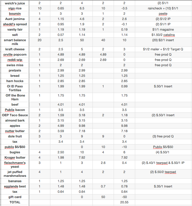 Notice she also had a $50 gift card. And if you live in GA – they double coupons. Her store may take some competitor Q’s that yours might not. My Publix won’t stack competitor with MFQ anymore. Lots of little variances make a big difference.