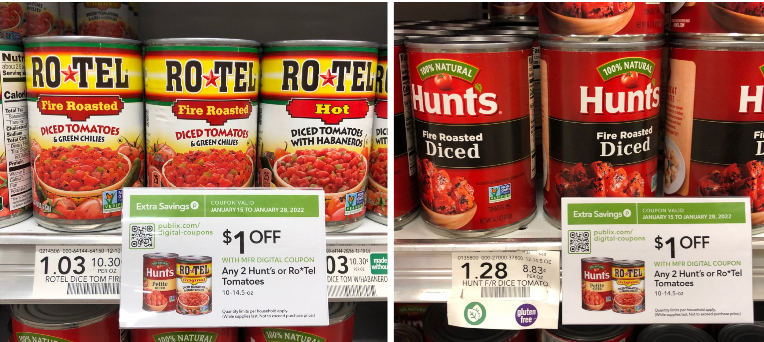 –$1/2 Hunt’s Tomatoes, 14.5 oz, or RO*TEL Tomatoes, 10 oz (Publix Digital Coupon)