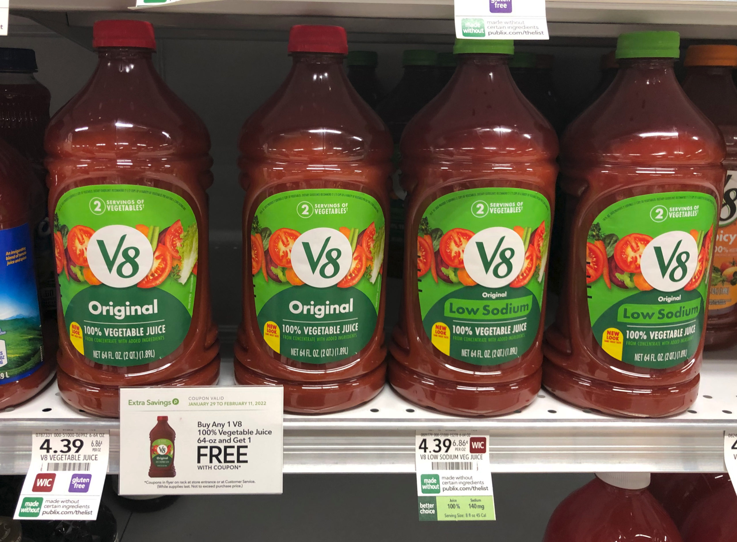 -B1G1 V8 100% Vegetable Juice, 64 oz, Extra Savings Flyer In-Ad Publix Coupon (valid 1/29 to 2/11), Extra Savings Flyer In-Ad Publix Coupon (valid 1/29 to 2/11)