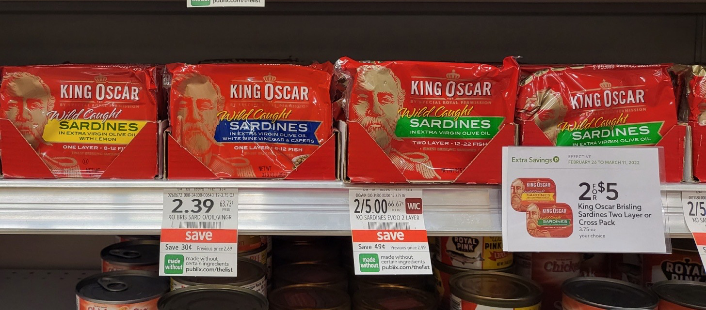 There is a King Oscar Sardines printable coupon to pair up to the new Publix sale! After all discounts you can pick the cans up for as low as $2.06 per can. I happen to LOVE sardines… don’t knock them ’till you try them 😉